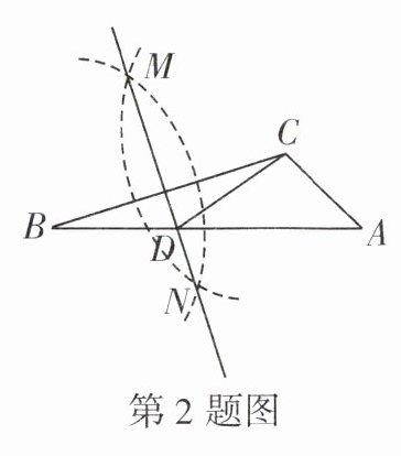 2. 如图,在已知的 $ \triangle ABC $ 中,按以下步骤作图:①分别以 $ B $,$ C $ 为圆心,以大于 $ \frac{1}{2}BC $ 的长为半径作弧,两弧相交于点 $ M $,$ N $;②作直线 $ MN $ 交 $ AB $ 于点 $ D $,连结 $ CD $. 若 $ AC = 3 $,$ AB = 9 $,则 $ \triangle ACD $ 的周长为______.