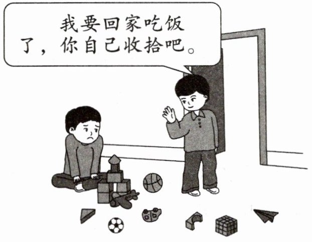 小明到乐乐家玩,到了下午吃饭的时间,他丢下玩具急匆匆地走了,乐乐家的地上一片狼藉。此刻,如果你是小明的好朋友,你会对他说些什么呢?