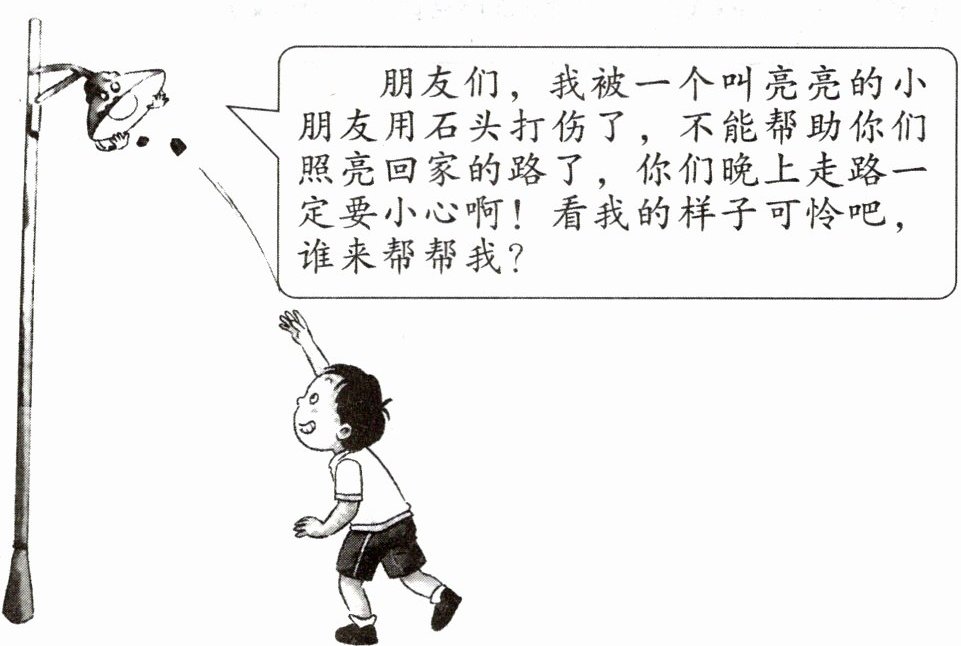 亮亮,路灯是为大家照亮道路的公共设施呀,它能让我们晚上走路更安全。你用石头打伤它是不对的,我们应该爱护它们,而不是伤害。以后可不能再这样做啦。