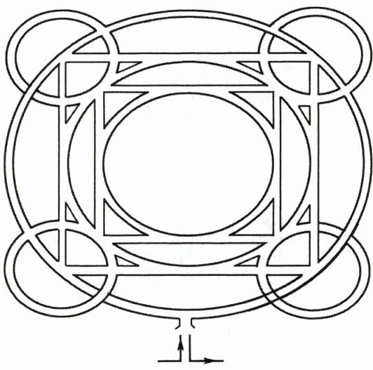 右图的迷宫,全部由正方形道路和圆形道路组成。在图形的下方有两个箭头,标明了那里既是入口,又是出口。在迷宫里面行走的规则,是每条路都必须走过,且每条路都只能走一次,路的交叉点可以多次通过。应该怎样走呢?