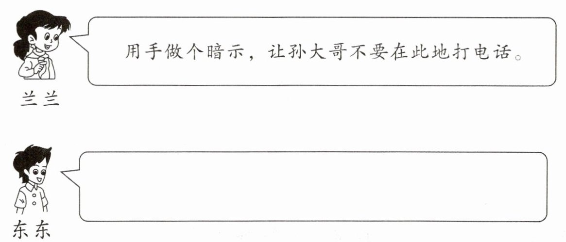 列车上,王爷爷正闭目养神,东东靠在座椅上休息,兰兰正在静静地看书。孙大哥接到朋友的来电后,大声地和朋友聊天。如果你是东东,你会怎么做呢?