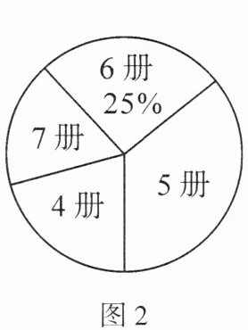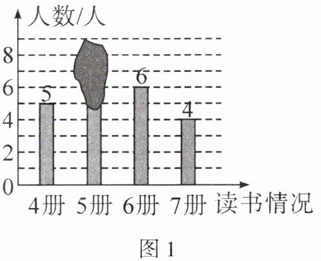 1. 老师随机抽查了本学期学生读课外书册数的情况,绘制成条形统计图(如图1)和不完整的扇形图(如图2),其中条形统计图被墨迹遮盖了一部分。
