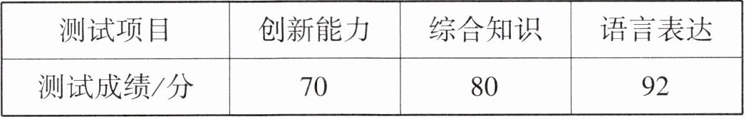 将创新能力、综合知识和语言表达三项测试成绩按5:3:2的比例计入总成绩,则该应聘者的总成绩是______分。