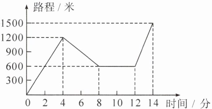 $12 - 14$分钟,路程从$600$米变为$1500$米,行驶的路程是$1500 - 600 = 900$米,速度为$900\div(14 - 12)= 450$(米/分)。