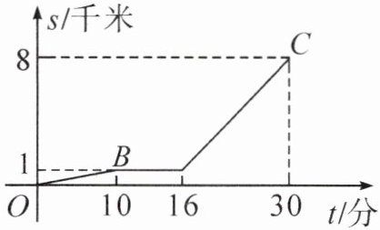 6. 小亮从家(图中点$O$)步行到公交站台(图中点$B$),等公交车去学校(图中点$C$),图中的折线表示小亮的行程$s$(千米)与所花时间$t$(分)之间的函数关系. 下列说法错误的是()