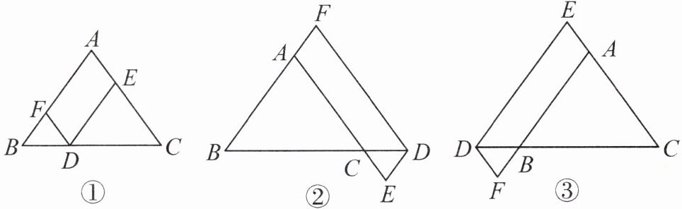 1. 在$\triangle ABC$中,$AB= AC$,点 D 在边 BC 所在的直线上,过点 D 作$DF// AC$交直线 AB 于点 F,$DE// AB$交直线 AC 于点 E.