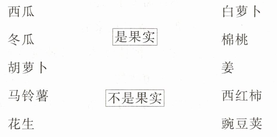 西瓜—是果实;冬瓜—是果实;棉桃—是果实;西红柿—是果实;花生—是果实;豌豆荚—是果实;白萝卜—不是果实;胡萝卜—不是果实;姜—不是果实;马铃薯—不是果实