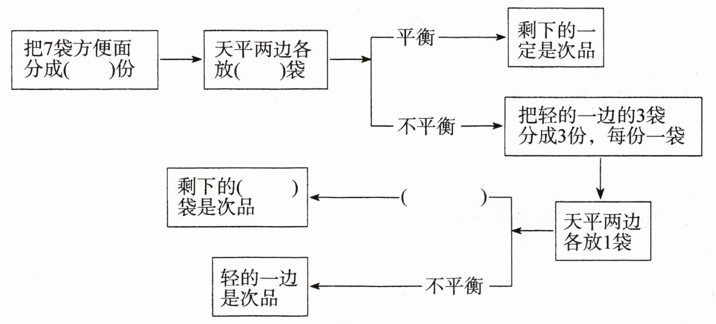 把7袋方便面分成()份 天平两边各放()袋 平衡 剩下的一定是次品