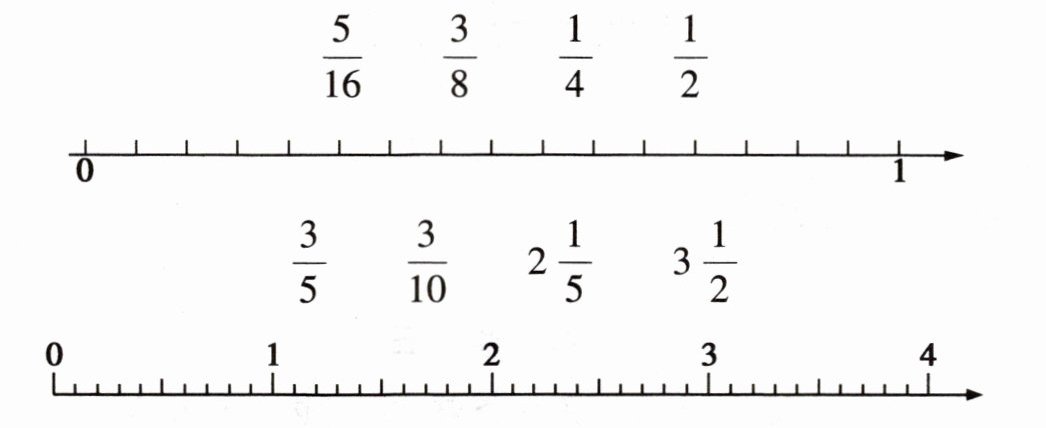 按照上述分析在相应数轴上找到各分数对应的点进行标注即可(由于无法直接在文本中精准画出标注后的数轴,学生可根据上述份数关系在给定数轴上完成标注)。