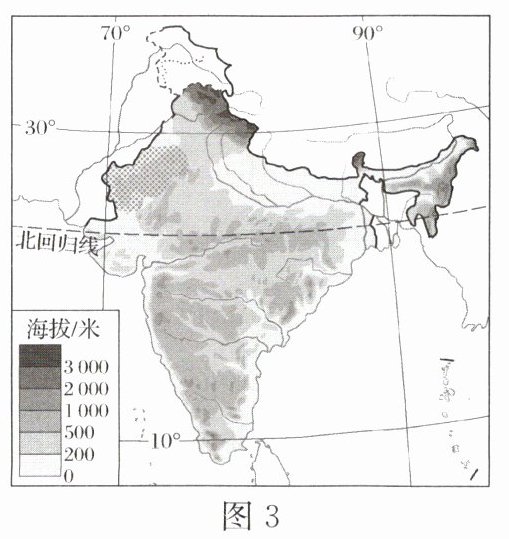 印度是世界上重要的小麦生产国,基本自给自足,增产年积极出口小麦,遇减产年需要进口小麦。近年来,随着印度小麦产量的不断提高,小麦出口的国际竞争力不断增强。读“印度简图”(图3)和“印度主要农作物分布图”(图4),完成6~8题。
