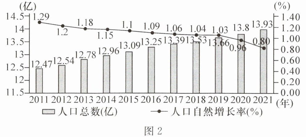 据《今日印度》杂志网站2024年7月13日报道,联合国的最新人口报告显示,印度人口将于21世纪60年代初达到17亿左右的峰值。读“印度2011—2021年人口变化图”(图2),完成3~5题。