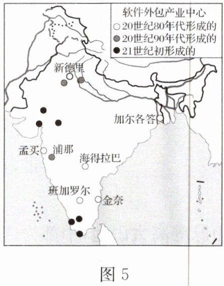 印度每年承接的软件外包产业业务在全球软件外包市场中占有重要地位,被形象地称为“世界办公室”。图5示意印度软件外包产业中心的形成年代与分布,读图,完成9~10题。