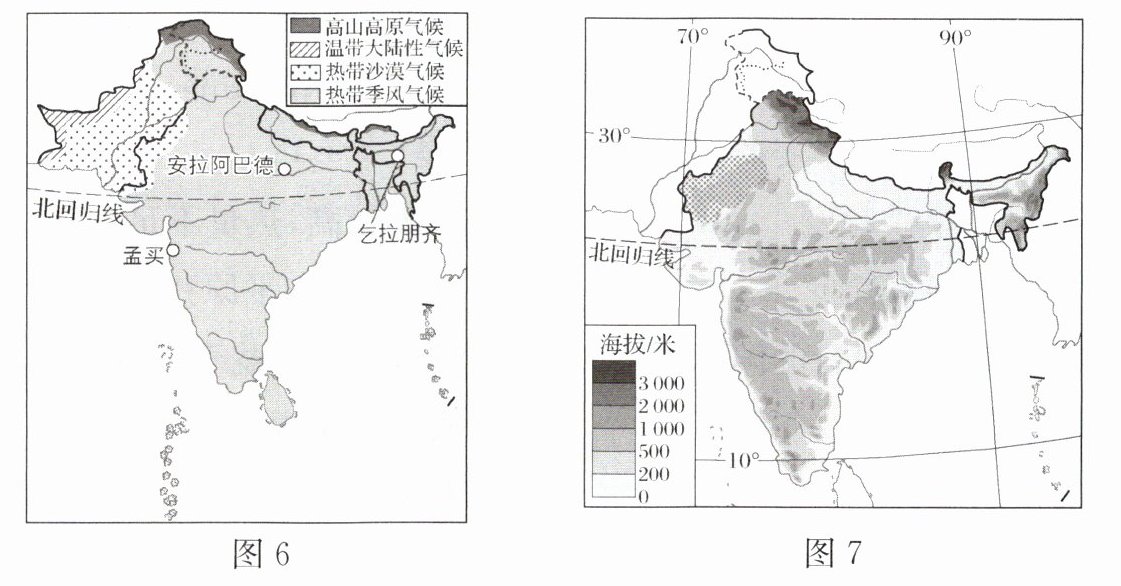 材料一 南亚气候分布示意图(图6)和印度地形图(图7)。