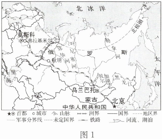 K3/4次列车是中国铁路的一趟国际联运快速列车,运行于中国北京至俄罗斯莫斯科之间。这趟列车于1959年6月4日起开行,至今已经有60多年的历史。读图文资料,完成1~2题。
