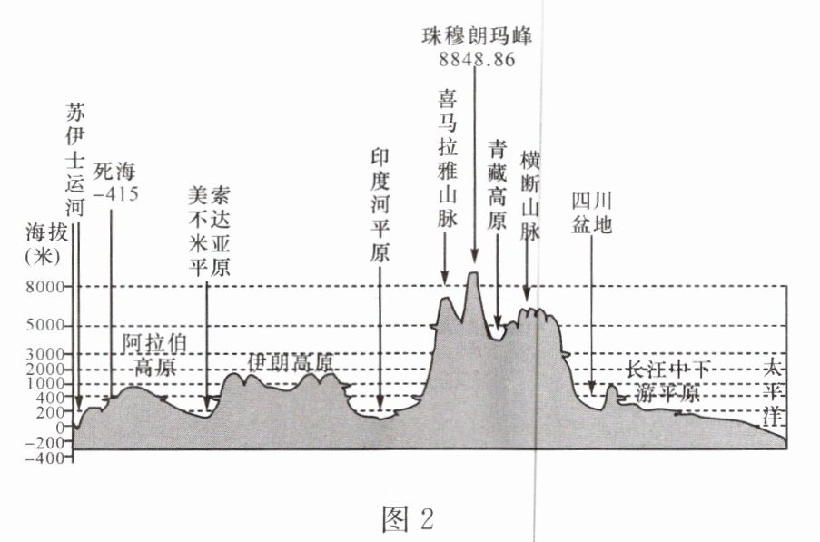 读“亚洲沿30°N地形剖面图”(图2),完成4~5题。