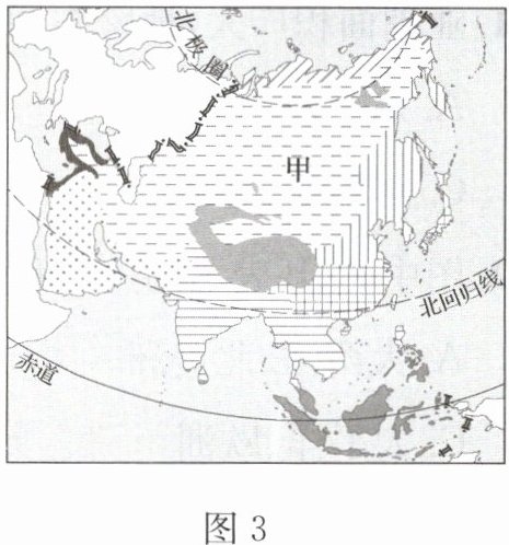 世界气象组织发布的《2023年亚洲气候状况》称,受天气、气候和与水有关的灾害影响,亚洲仍然是世界上受灾最严重的地区。洪水和风暴给人们的生产、生活造成极大的不利影响。读亚洲局部地区气候分布图(如图3),完成6~7题。