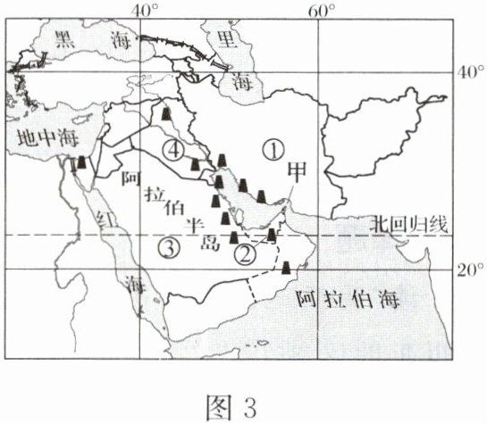 2024年1月1日,西亚地区的沙特阿拉伯、埃及、阿拉伯联合酋长国、伊朗成为金砖国家正式成员。读“西亚国家分布图”(图3),完成6~8题。