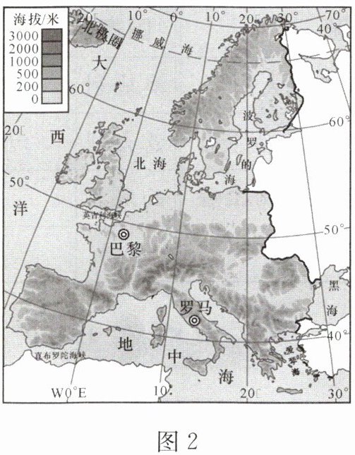 读“欧洲西部地形图”(图2),完成4~5题。