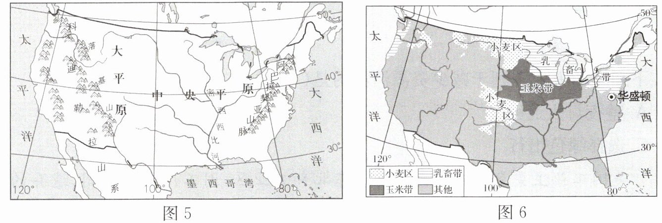 材料二 美国地形简图(图5)和美国本土农业带分布图(图6)。