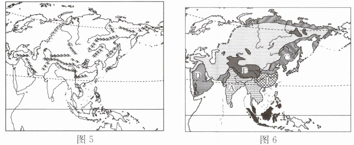 11. 某中学地理兴趣小组以亚洲为例,探究“大洲的自然环境及其自然地理要素相互影响”,结合亚洲水系图(图5)和气候类型分布图(图6),请你与该小组一起完成探究过程。
