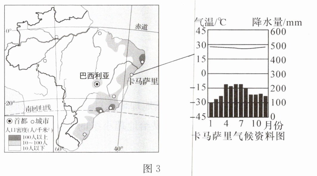 我国某新能源车企将在巴西东北部的卡马萨里市建设大型生产基地,预计2024年下半年投产,将为当地增加5000多个就业岗位。图3示意卡马萨里位置和卡马萨里气候资料图。据此完成6~8题。