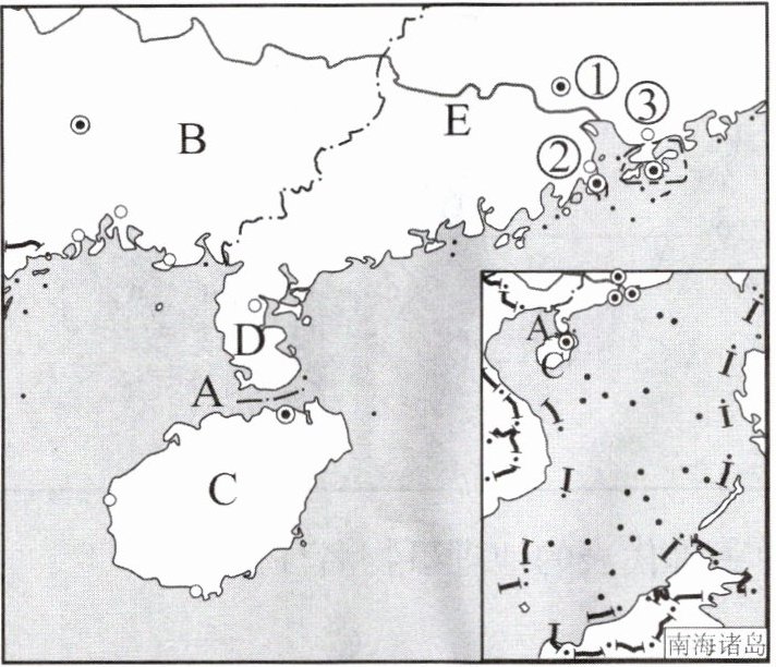A______海峡,B______自治区,C______岛,D______半岛,E省的简称是______。
