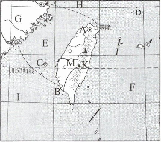 (2)台湾的地形特点是______部为山地,以______为骨干,西部为______。图中K为著名的______山。
