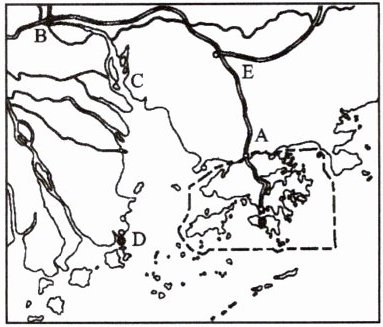 城市:A ,B ,D 经济特区;河流:C ;铁路:E 。