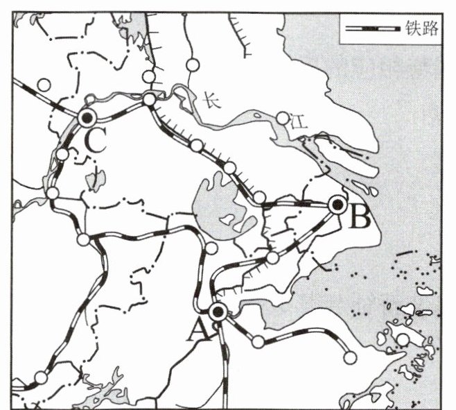 (1)图中字母B代表上海,它位于哪两条铁路交会处?