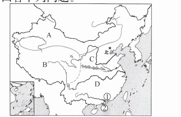 (1)西北地区;青藏地区;北方地区;南方地区;(2)C、D;A、B;(3)②;(4)秦岭 - 淮河一线;夏季高温多雨,冬季寒冷干燥;(5)高寒;热量不足;柴达木;(6)干旱;西气东输、西电东送