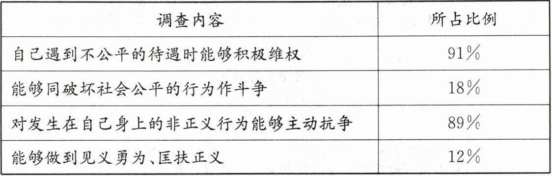 (1)①多数同学能够与发生在自己身上的不公平待遇和非正义行为作斗争。②部分同学缺乏维护社会公平与正义的责任感。
