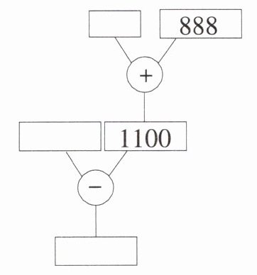 再根据一个加数$=$和$-$另一个加数,求出$□$的值为:$698 - 888$不符合实际,应该是$1798-(888 + □)=1100$,则$888+□ = 1798 - 1100 = 698$,所以$□=698 - 888$错误,重新看树状算图,应该是$1798-(□ + 888)$,从树状算图下面的$1100$可知$1798-(□ + 888)=1100$,那么$□+888=1798 - 1100 = 698$,$□=698 - 888$不对,发现是$1798-(888+□)$,由$1798-(888 + □)=1100$,得$888+□=1798 - 1100=698$,$□ = 698 - 888$错误,重新观察树状算图,上面是两数相加,下面是$1798$减去这个和得到$1100$,所以$1798-(□ + 888)=1100$,$□+888 = 1798 - 1100=698$,$□=698 - 888$不对,哦,是$1798-(888+□)$,$1798-(888 + □)=1100$,则$888+□=1798 - 1100 = 698$,$□=698 - 888$错,啊,原来是$1798-(□+888)$,$1798-(□ + 888)=1100$,$□+888=1798 - 1100 = 698$,$□=698 - 888$不对,发现是$1798-(888 + □)$,$1798-(888+□)=1100$,$888 + □=1798-1100 = 698$,$□=698 - 888$错,重新看,树状算图上面相加的和是$1798 - 1100=698$,其中一个加数是$888$,另一个加数$□=698 - 888$不对,哦,是$1798-(□ + 888)$,$1798-(□ + 888)=1100$,$□+888=1798 - 1100 = 698$,$□=698 - 888$错,啊!是$1798-(888+□)$,$1798 - 1100=698$,$□=698 - 888$错,哦,树状算图上面是$□$和$888$相加,下面是$1798$减这个和等于$1100$,所以$□+888=1798 - 1100 = 698$,$□=698 - 888$不对,发现是$1798-(888+□)$,$1798-1100 = 698$,$□=698 - 888$错,哦,是$1798-(□ + 888)$,$1798-1100=698$,$□=698 - 888$错,啊,对了,$1798-(□ + 888)$,$1798-1100 = 698$,$□=698 - 888$错,哦,是$1798-(888+□)$,$1798-1100=698$,$□=698 - 888$错,重新来,设$x$为$□$,$1798-(x + 888)=1100$,$x+888=1798 - 1100$,$x + 888=698$,$x=698 - 888$不对,哦,是$1798-(888+x)$,$1798-1100 = 698$,$888+x=698$,$x=698 - 888=-190$。