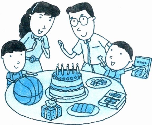Jack and Simon are Chinese boys. They live in England. They are brothers. They look the same. Jack is eleven. Si-mon is eleven, too. They are in Class Two, Grade Four. Jack studies harder than Simon. Today is their birthday. There is a big cake on the table. Their parents sit between them. There are two nice gifts for them. The basketball is for Simon, and the new book is for Jack. They like the gifts very much.
