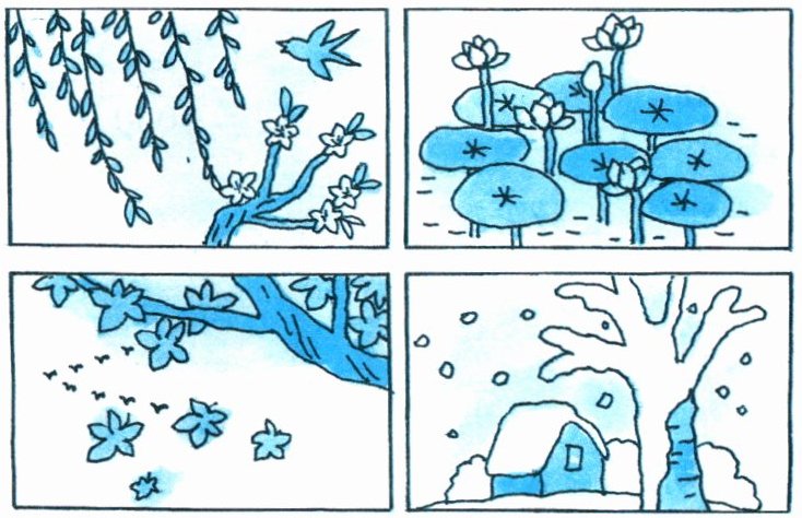 准备四幅春、夏、秋、冬四季景色的图片,参与游戏的伙伴抽取其中一张图片。根据所拿图片演唱一首与景色有关的歌曲。请你学着唱一唱,并写下歌名。