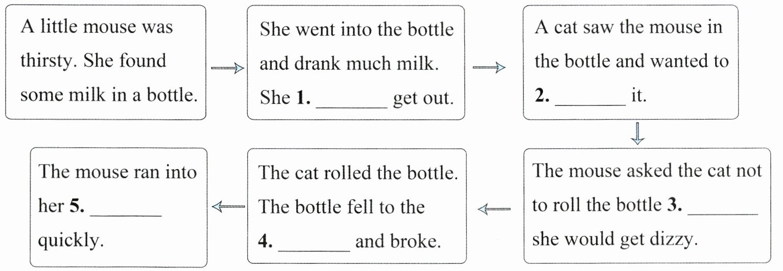 One day, a little mouse was thirsty. She looked for water everywhere. She climbed up onto a table and saw a bottle on the table. She smiled, “Ha, there’s some milk in it. That’s great!” The mouth of the bottle was big. She went into it and began to drink.