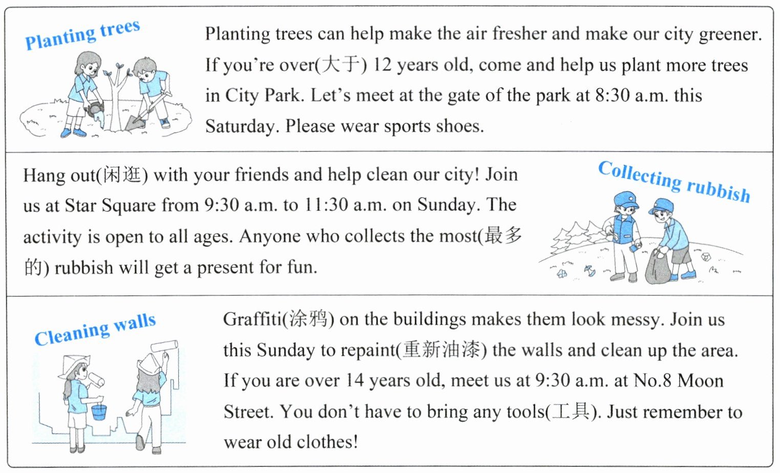 (A)1. C 2. A 解析:由 Cleaning walls 一栏中“If you are over 14 years old, meet us at 9:30 a.m. at No. 8 Moon Street.”可知,清洁墙壁要求年龄在 14 岁以上,13 岁的 Oliver 无法参加此活动。故选 A。3. B 4. A 解析:海报显示,12 岁以上的人可以参与植树,14 岁以上的人可以参与清洁墙壁,任何年龄段的人都可以参与捡垃圾活动。由此可见,为了使我们的城市更好,每个人都可以贡献一份力量,A 项表述正确。故选 A。5. I want to plant some trees/collect some rubbish/clean the walls ...(答案不唯一)(