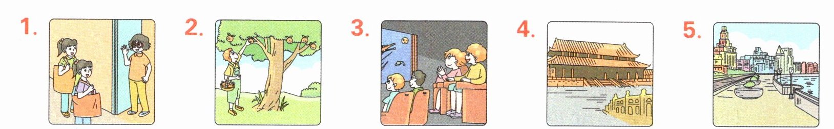 1. Saturday 2. at home 3. did homework 4. picked pears 5. caught fish 6. fashion show