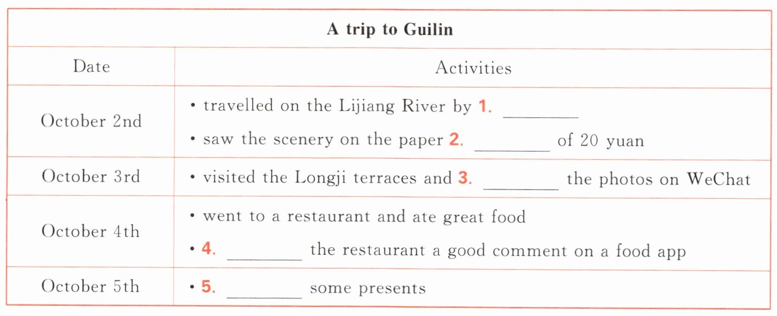 三、“桂林山水甲天下”,亮亮跟着父母一起去了桂林市旅行。请根据亮亮回来后写的游记,
