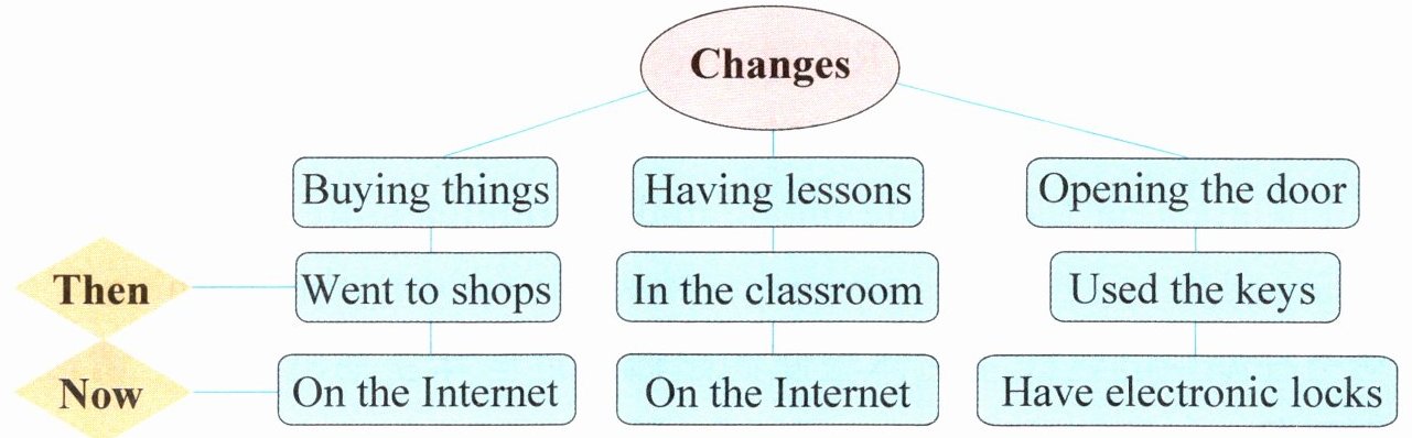 There are a lot of changes in our life. Then, if we wanted to buy something, we had to go to shops. We always had lessons in the classroom. And we used the keys to open the doors. Now we can do shopping on the Internet. We can have lessons on the Internet too. And we have electronic locks. We can open the doors with our fingerprints.