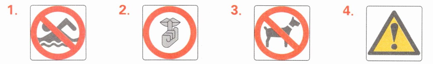 1. swimming 2. quiet 3. pets 4. Danger