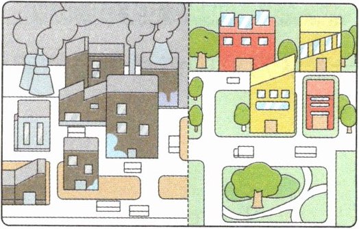 Please look at the picture of these two ____. We can see the city on the ____ is very dirty. And the city on the right is ____ and tidy. Why? In the left city, they burn (烧) coal for electricity. We can see black ____ from chimneys (烟囱). It makes the air ____. In the right city, they use solar power (太阳能). That will not pollute the water ____ the air. We can see a lot of ____ and grass in the city. It is a real “Green City”. We want to ____ in a city like this.