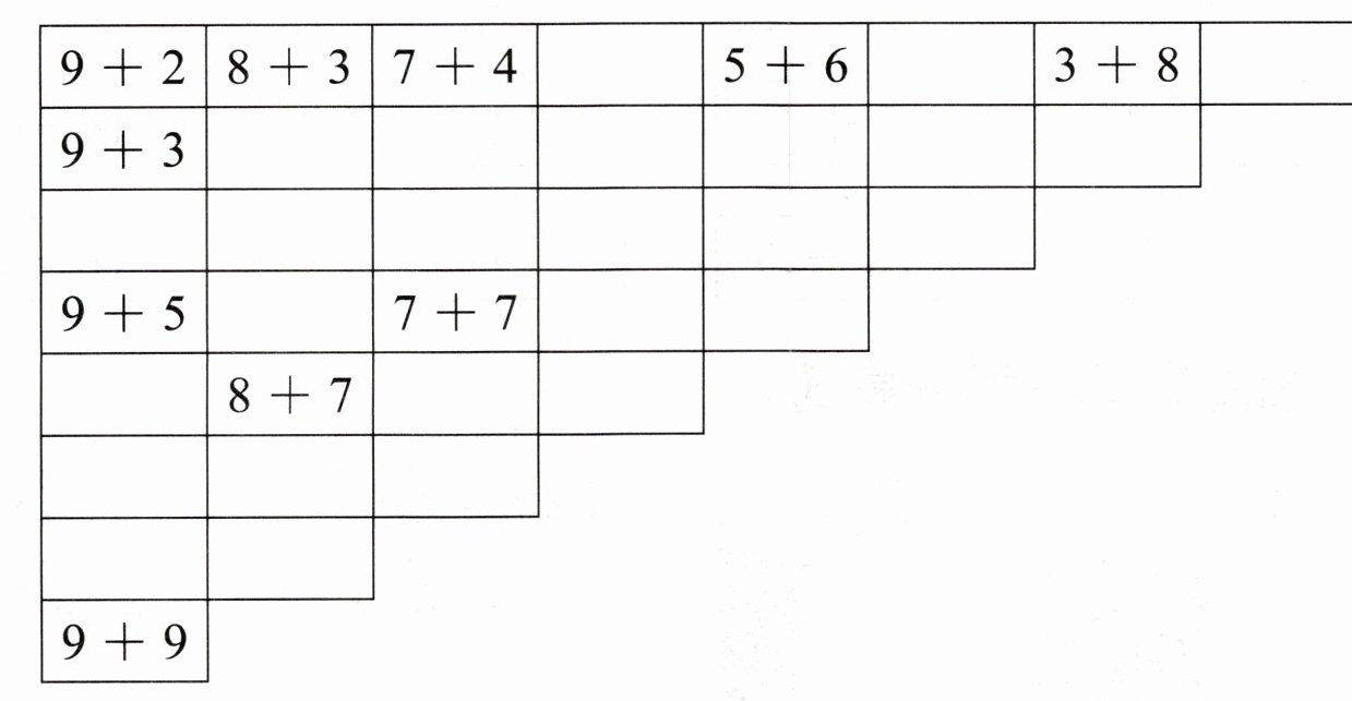 | $9+2$ | $8+3$ | $7+4$ | $6+5$ | $5+6$ | $4+7$ | $3+8$ | $2+9$ |