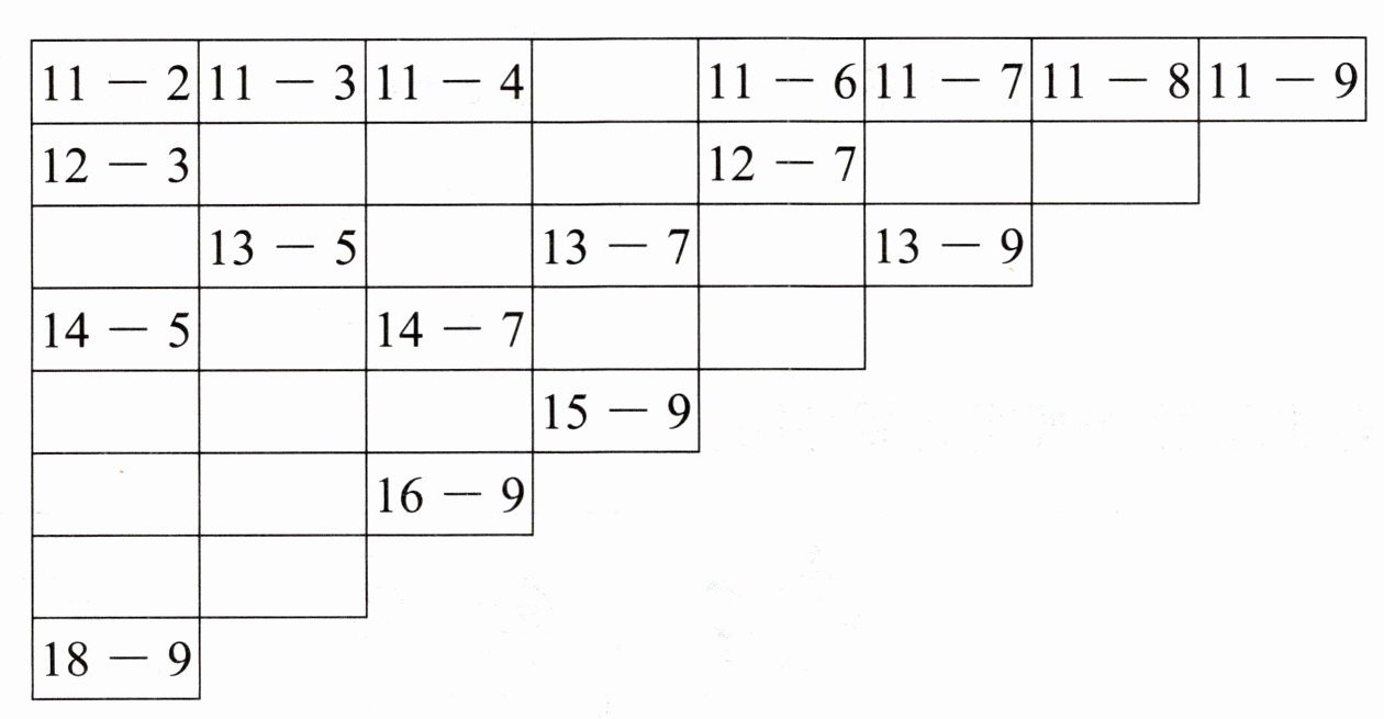 - (4)在减法表中得数是$9$的算式有$11 - 2$,$12 - 3$,$13 - 4$,$14 - 5$,$15 - 6$,$16 - 7$,$17 - 8$,$18 - 9$。