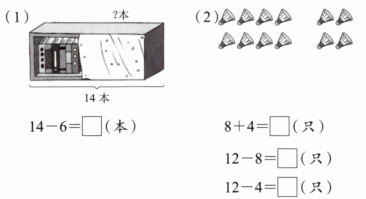 (2) $8 + 4$,可以用凑十法,把$4$分成$2$和$2$,先算$8 + 2 = 10$,再算$10 + 2 = 12$;$12 - 8$,想加法算减法,因为$8 + 4 = 12$,所以$12 - 8 = 4$;$12 - 4$,同样想加法算减法,因为$4 + 8 = 12$,所以$12 - 4 = 8$。