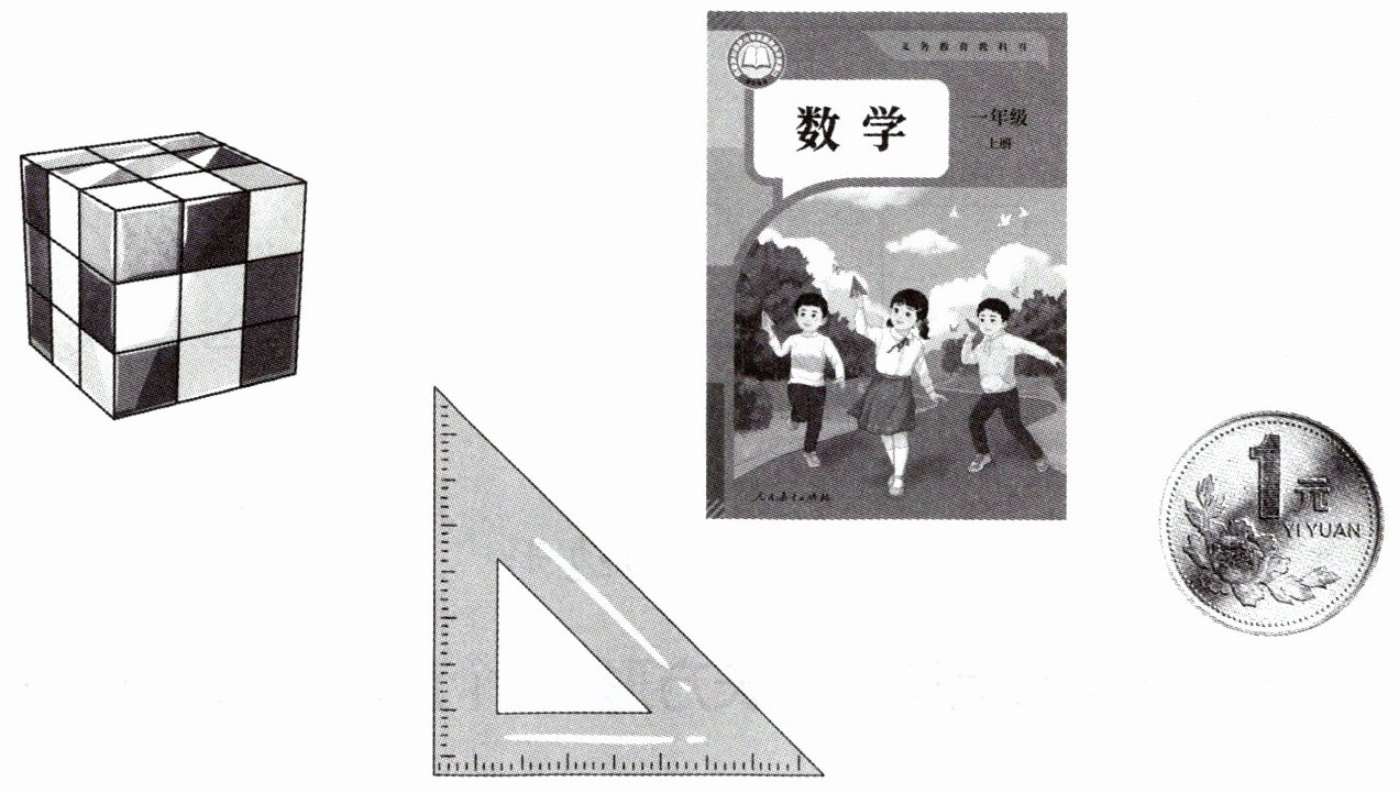 【解析】:通过观察物体的面的形状特征,与所学的平面图形进行对比。魔方的每个面,四条边相等,四个角都是直角,符合正方形的特征;数学书封面,对边相等,四个角都是直角,符合长方形的特征;三角尺的面,有三条边,三个角,符合三角形的特征;硬币的面,是一个封闭的曲线图形,符合圆形的特征。