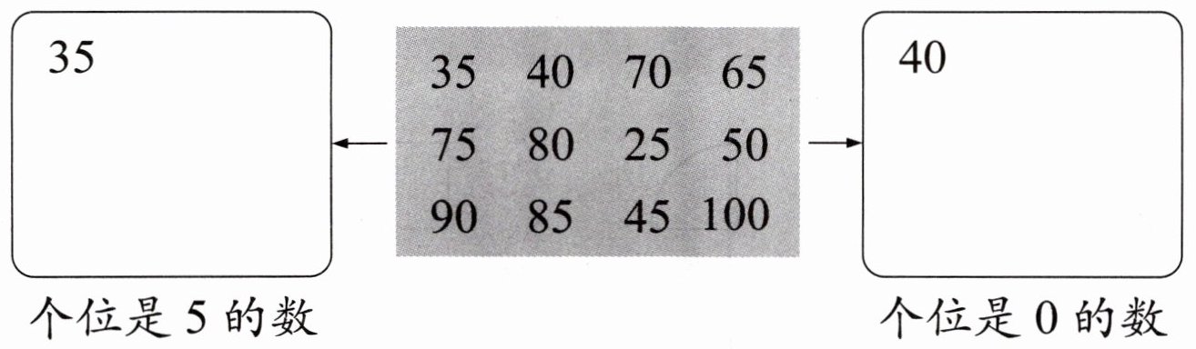 【解析】:根据个位数字的特征进行分类,个位是$5$的数有$35$、$65$、$75$、$25$、$85$、$45$;个位是$0$的数有$40$、$70$、$80$、$50$、$90$、$100$。