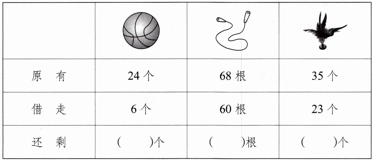 【解析】:本题考查减法运算,用原有的数量减去借走的数量就是剩下的数量。