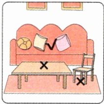 B: Oh, look! It's ____ the cushions(靠垫) ____ the sofa.