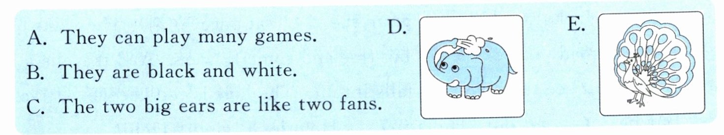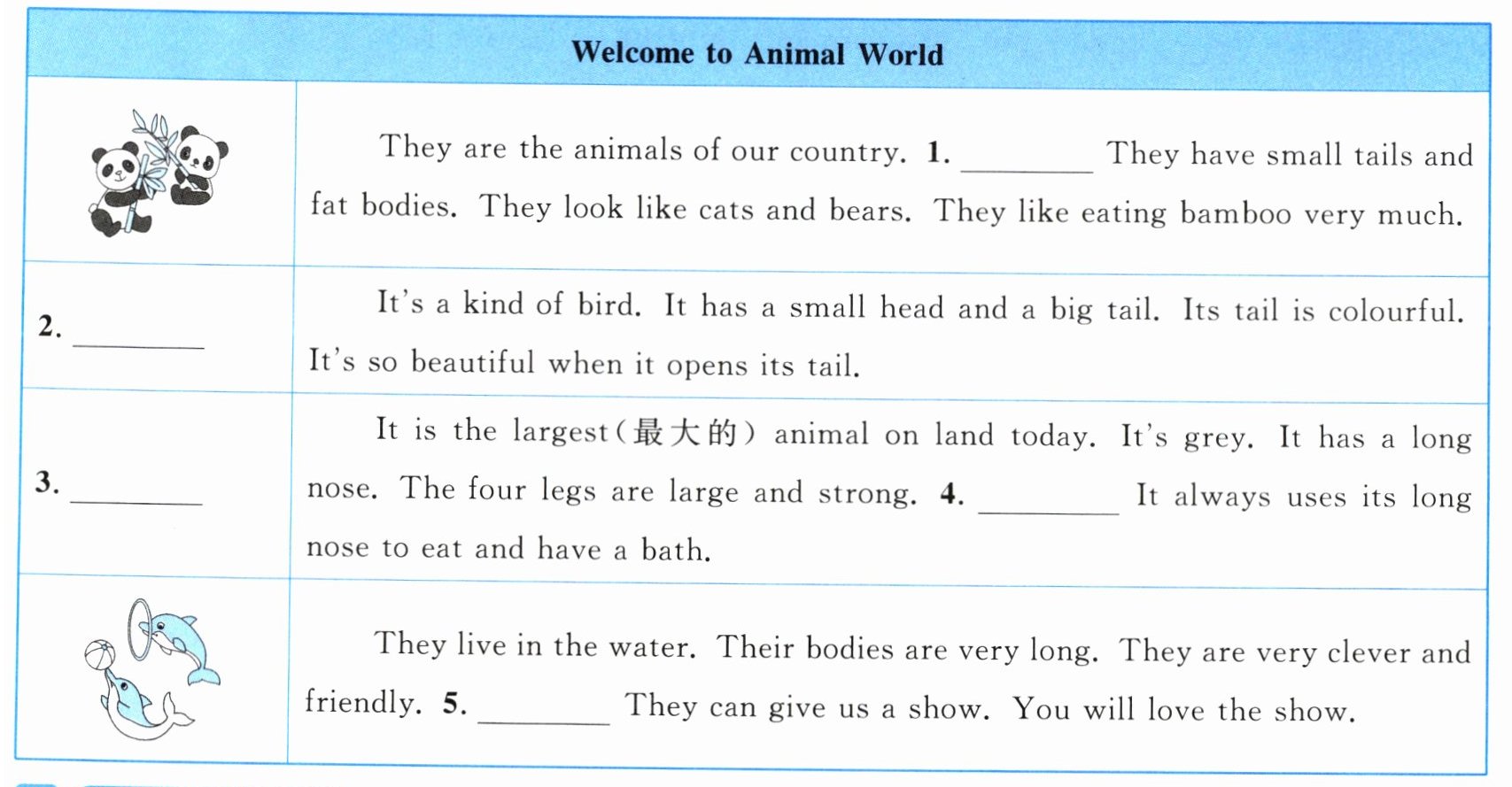 九(连云港灌云县期中)从方框中选择合适的句子或图片,补全动物世界的宣传册。(5分)