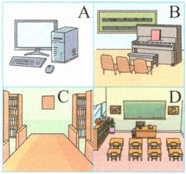 1. D,classroom 2. C,library 3. A,computer 4. B,music room